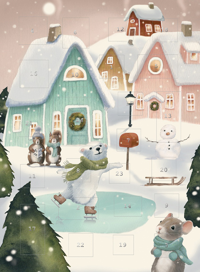 Tämä joulukalenteri vie sinut tunnelmalliseen joulukylään ja tuo joulun odotusta lapselle ja lapsenmieliselle! 24 luukkua, joiden takaa ilmestyy ihania jouluisia asioita. Koko A4. Design: Henna Adel.