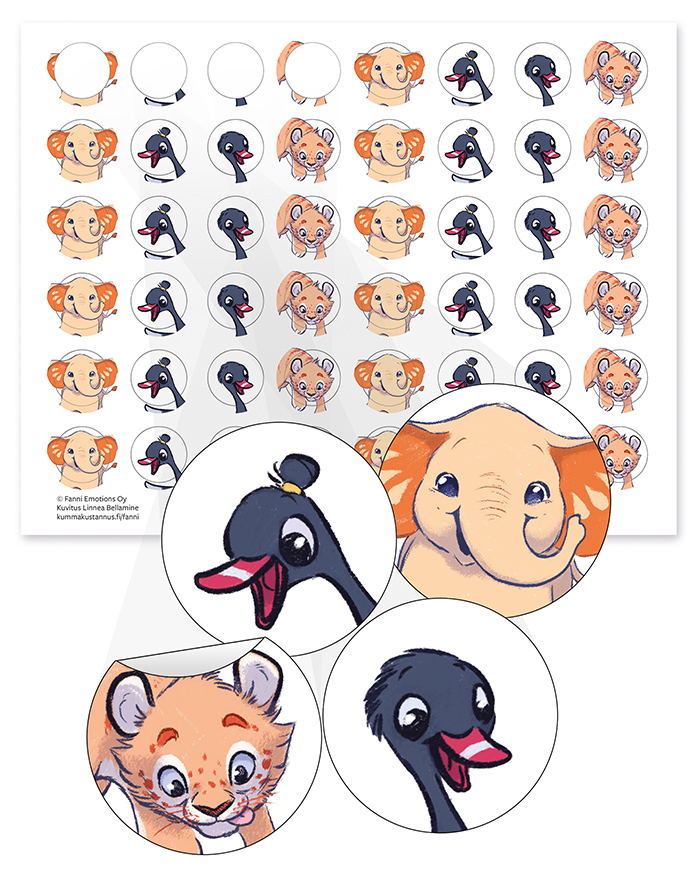 Suloiset Fannin hahmotarrat tunnetaitojen harjoitteluun tai arkea ilahduttamaan! Arkissa on yhteensä 48 tarraa Fanni-norsusta ja ystävyksistä. Tarroja voi käyttää Fanni-seinäkalenterin tunnetaitotehtävien merkitsemiseen, mutta ne sopivat hyvin myös kaikenlaiseen askarteluun ja koristeluun. Tarra-arkin koko on 20 x 28 cm. Hahmokuvat on tehnyt Linnea Bellamine.