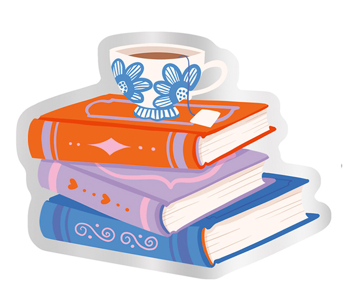 Ihana muotoitarra, jonka kuvassa on pastellivärinen kirjapino ja höyryävä teekuppi!Tehosteena hopeafoliota. Koko noin 9 x 9 cm. Design: Kaisu Sandberg. Vinyylitarra, painettu Suomessa.