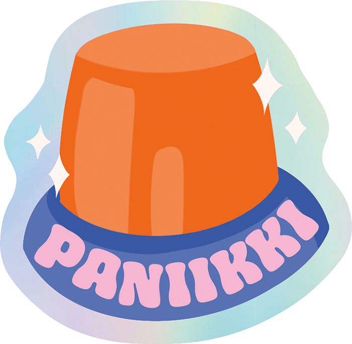 Hauska vinyylitarra missä nappula ja alla teksti "paniikki".Tehosteena hologrammifoliota.Koko noin 9 x 9cm.Painettu Suomessa.Desingn Kaisu Sandberg.