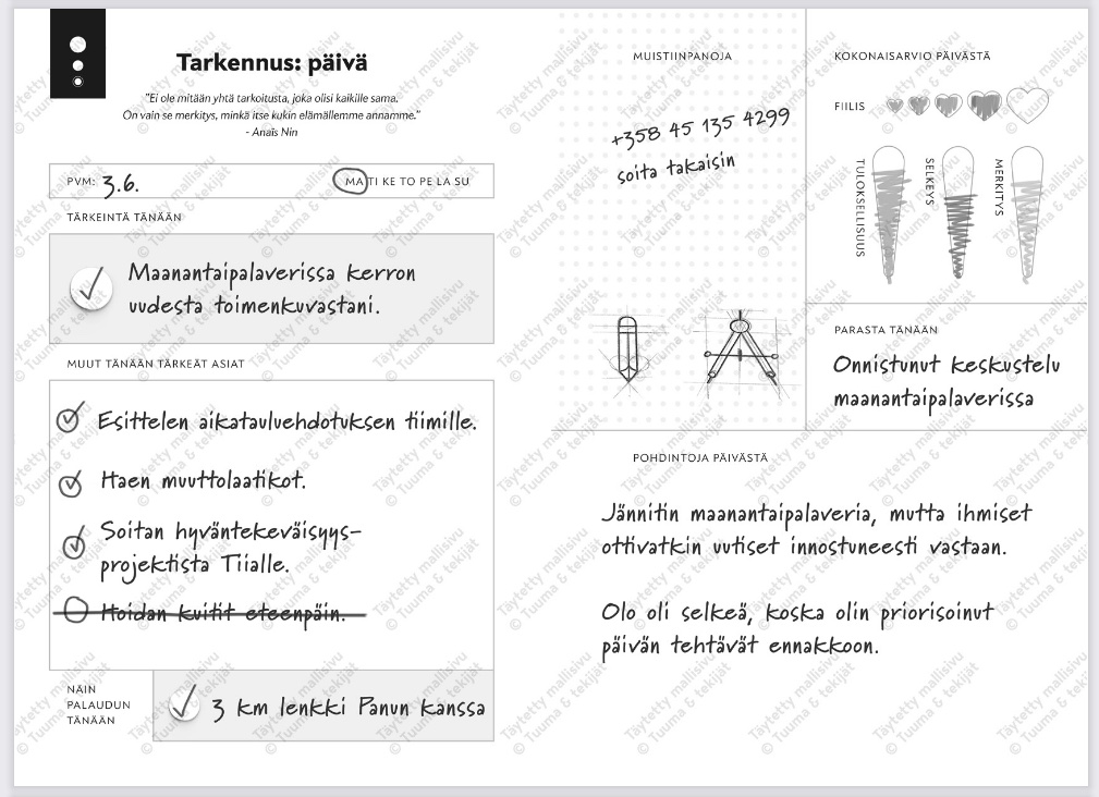 Tänään on arjen työkalu oman elämän jäsentämiseen niin, että siihen tulee lisää selkeyttä, tuloksellisuutta ja merkitystä. Työkalussa elämää tarkastellaan kolmella eri tasolla: elämä, viikko ja päivä.
