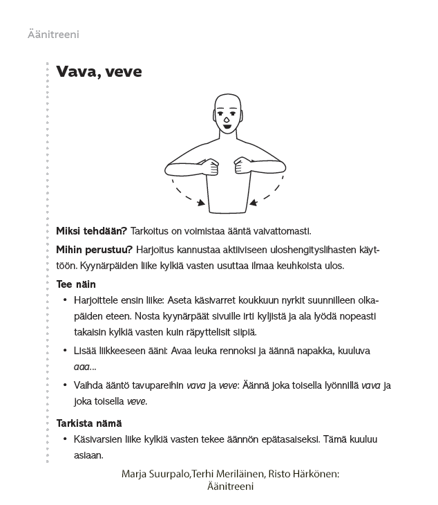Kirja tarjoaa käytännönläheisiä ohjeita äänen treenaamiseen ja äänestä huolehtimiseen. Siinä käydään läpi äänen tuottamisen ja puhumisen perusasioita, joista jokaisen ääntään käyttävän on hyvä olla tietoinen. Kirjan harjoitukset ovat varsinainen aarrearkku: yli 70 erilaista helppoa, arkeen sopivaa ääniharjoitusta, joiden avulla ääneensä voi vaikuttaa. Harjoitusten kulku on kuvattu selkeästi ja havainnollisesti. Lukija saa tietää myös, miksi kutakin harjoitusta tehdään ja mihin harjoituksen teho perustuu.