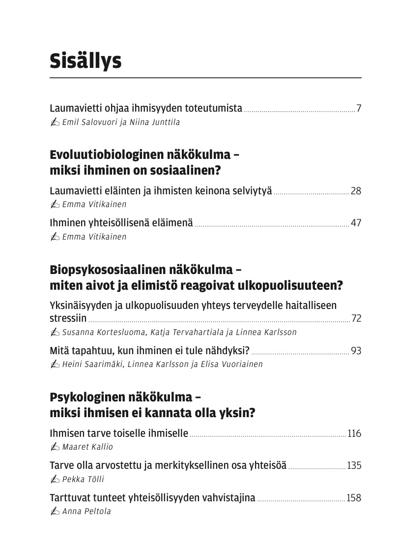 Ulkopuolisuus satuttaa, sairastuttaa ja saa taistelemaan toisia ihmisiä vastaan. Miksi ihminen voi huonosti ilman laumaa? Miksi ihminen tarvitsee toisia ihmisiä elääkseen hyvää ja merkityksellistä elämää?