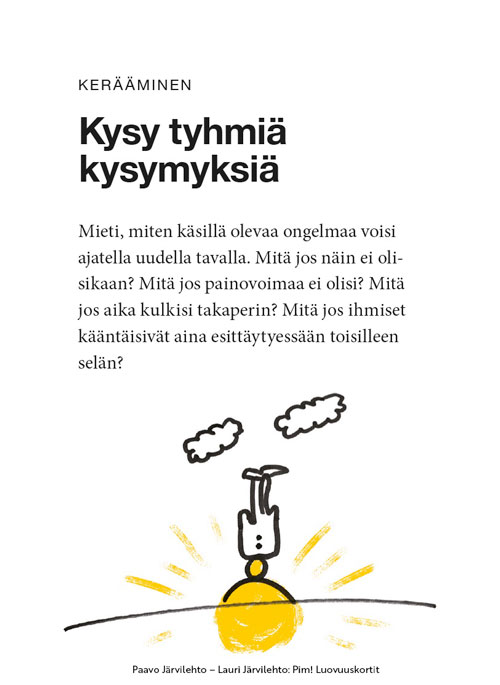 huomio laadussa. Jos luova prosessi junnaa paikallaan, ota keräämiseen keskittyvät kortit käteesi ja valitse pakasta yksi sattumanvarainen kortti. Toimi kortin ohjeiden mukaan ja kerää lisää materiaalia luovaa työtäsi varten. Savipatsasta ei voi tehdä ilman savea eikä luovaa työtä ilman kerättyjä ideoita.