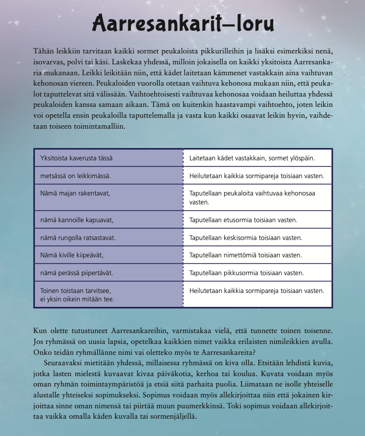 Kirja sisältää 10 tarinaa, joiden kautta päästään lasten kanssa leikkien pohtimaan monia yhdessä toimimisen taitoja. Bonuksena on yhdestoista tarina, jossa käydään läpi toiminnan dokumentointia ja mediakasvatusta. Hypätkää Sissi Sisiliskon, Kaarna Käärmeen ja muiden ryhmäläisten kanssa hauskaan harjoitteluun.