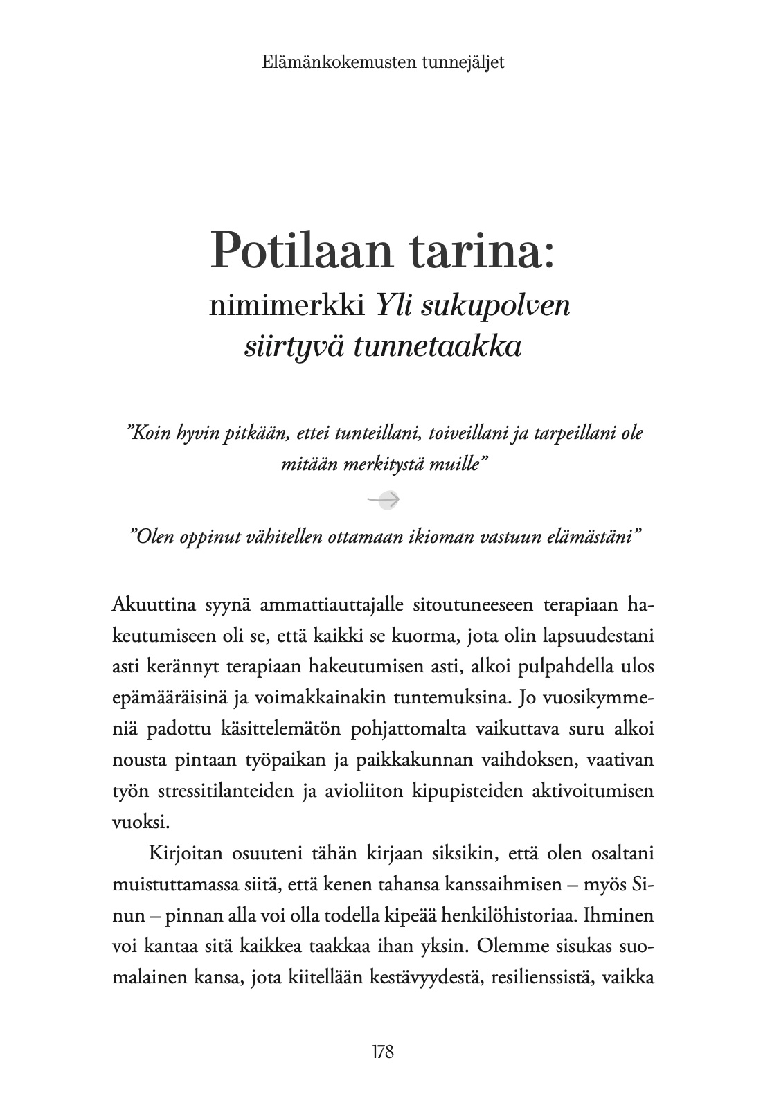 Tämä teos tarjoaa ainutlaatuista kokemustietoa mielenterveyden ylläpitämisestä. Kirjassa tutustut koskettaviin elämäntarinoihin, joissa psykoterapian läpikäyneet kertovat, mitä he oppivat itsestään ja mikä auttoi selviytymään eteenpäin. Tarinoita kehystää heidän psykoterapeuttinsa näkökulma, joka tuo esille psykoterapian roolia sekä sitä, miten voi kasvattaa tietoisuuttaan huonovointisuutta ylläpitävistä asioista. Kun itseään ymmärtää paremmin, voimavaroistaan on helpompi pitää kiinni.
