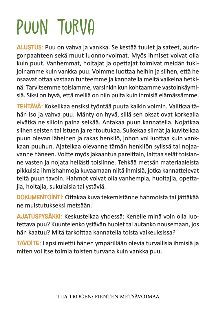 Tunteiden tikku-ukko, Vahvuuksien eläin, Rauhoittumiskivi ja muut korttien tehtävät ohjaavat lempeällä tavalla etsimään voimaa ja hyvinvointia luonnosta. Tehtävät sopivat parhaiten 2—6-vuotiaille, mutta niitä voi hyvin tehdä isompienkin lasten kanssa. Ohjevihkossa kerrotaan, miten positiivinen kasvatus yhdistetään luontopedagogiikkaan, ja opastetaan korttien monipuoliseen käyttöön.
