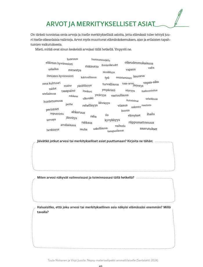 Nepsy-materiaalipakki ammattilaiselle auttaa opettajia, ohjaajia, kasvattajia ja valmentajia tukemaan ratkaisukeskeisesti henkilöitä, joilla on neuropsykiatrisia erityispiirteitä. Pääpaino on käytännössä toimiviksi havaituissa ja eri ikäryhmille sovellettavissa tehtävissä, jotka vahvistavat voimavaroja ja tukevat uuden oppimista.