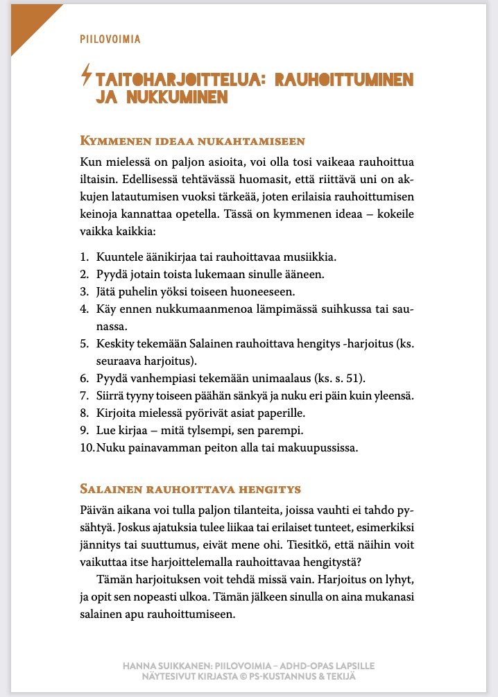 Kirjaan kirjoitettavat tehtävät ja taitoharjoitukset ovat käytännönläheisiä, helposti ymmärrettäviä ja pilkottu pieniin osiin - eli juuri sellaisia, joita ADHD-oireinen lapsi tarvitsee. Koko kirjan henki on ratkaisukeskeinen ja kannustava. Esimerkiksi kaveritaito-tehtävässä mietitään, millainen kaveri haluaa itse olla muille ja mitä jo osaa, sen sijaan, että lähdettäisiin liikkeelle puutteellisista taidoista. Kun kirjaa tekee järjestyksessä yksin tai yhdessä aikuisen kanssa, lapsi oppii varmasti uusia asioita ja saa ideoita sujuvampaan arkeen.