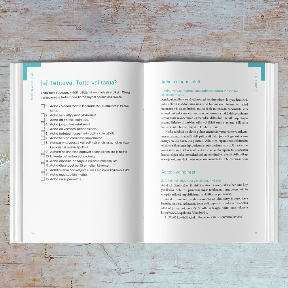Opas sopii nuorille, vanhemmille ja heidän kanssaan työskenteleville ammattilaisille. Sitä voidaan käyttää apuna myös nepsy-valmennuksessa ja erilaisissa kuntoutuksissa. Kirja on laadittu yhteistyössä ADHD-liiton kanssa.