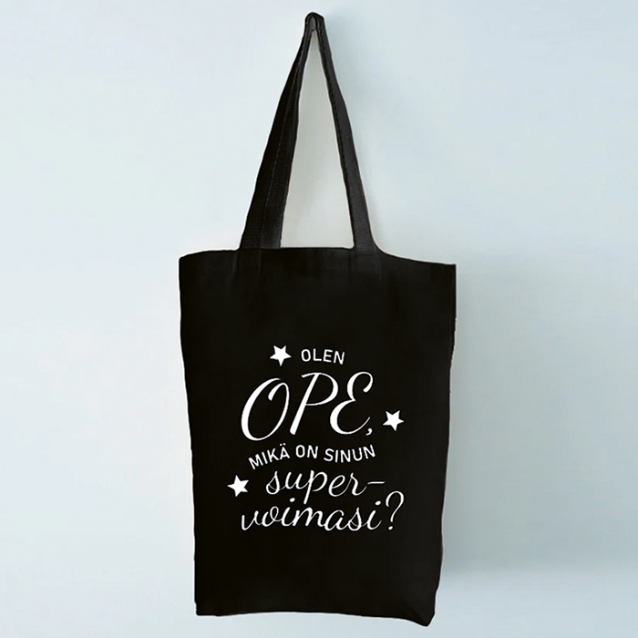 Täydellinen lahja opettajalle tai vaikkapa itsellesi!Luomupuuvillainen, reilun kaupan laadukas kangaskassi.Painettu teksti "Olen ope, mikä on sinun supervoimasi?" Koko 36 x 40 cm + pohja 10 cm, 60 cm hihnat.