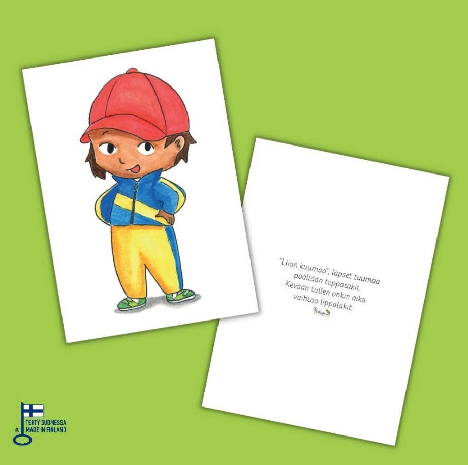 Pakkaus sisältää: 10 korttia, joissa jokaisessa on kuva ja loru. Kortin koko: A6 (postikorttikoko). Tuote on pakattu kansioon. Tuotteella on Avainlippumerkki.