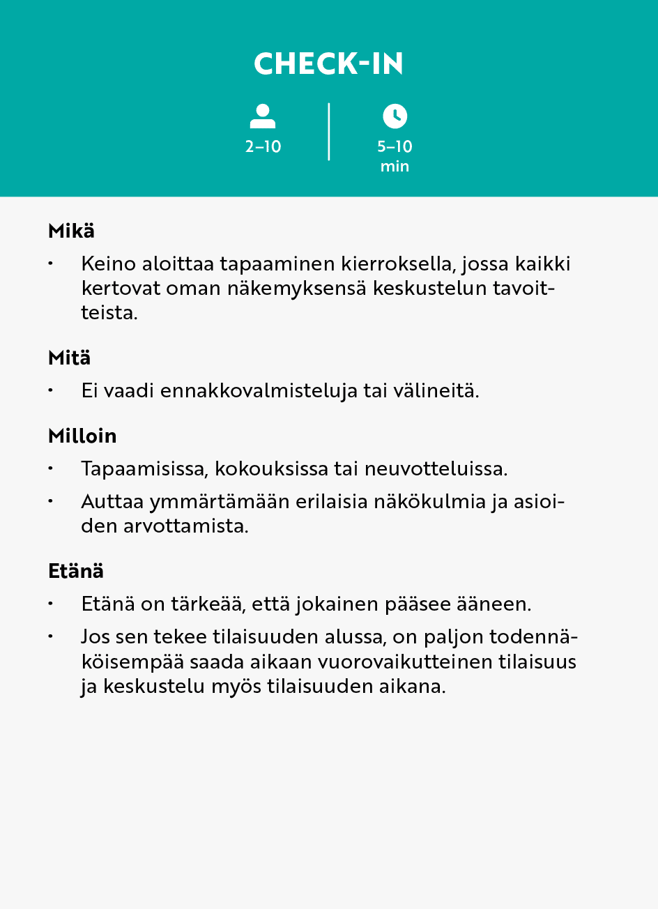 Kokoukset ja palaverit on menetelmäpaketti kaikille kokoustajille. Moderni kokous on vuorovaikutteinen, osallistava ja sopeutuu osallistujien tarpeisiin. Kokoukset eivät ole sidoksissa paikkaan eikä niiden tarvitse olla aina samanlaisia. Etätyö, hajautetut tiimit ja kokoustekniikka vaihtelevat, joten mikseivät kokouksetkin olisi erilaisia. Oli kyseessä sitten pienemmät tai isommat tiimit, kehittäminen tai ongelmanratkaisu — fasilitoimalla kokouksia ja palavereita saat yhdessä aikaiseksi tuloksia sekä motivoivampaa työn arkea.