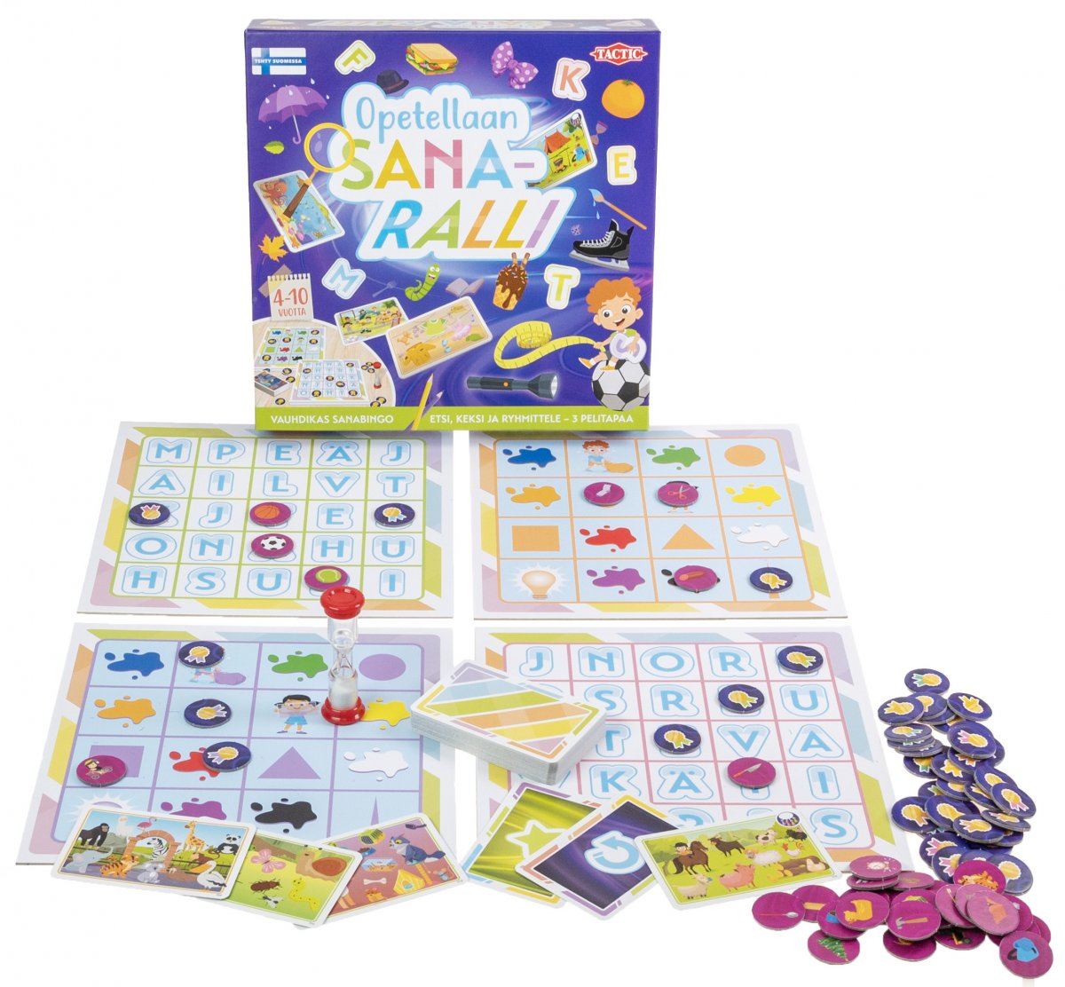 Tutkikaa kuvia ja etsikää kilpaa eri alkukirjaimilla alkavia sanoja. Jokaisesta sanasta saat pelimerkin bingolaudallesi. Ensimmäinen viiden rivi voittaa! Pelissä on kaksi tasoa — nuorimmat pelaavat kuvalaudoilla. Tukee lukemaan oppimista. Erikoiskortit tuovat peliin jännitystä! Mukana hauska luokittelupeli, joka kehittää sanavarastoa ja ajattelutaitoja.
