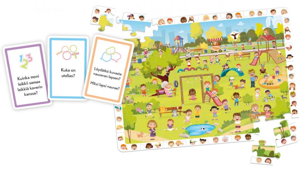 kateutta ja paljon muuta. Vinkkikortit kutsuvat tutkimaan kuvaa. Onko joku pelästynyt? Mitä on mahtanut tapahtua? Montako nauravaa lasta löydät?
