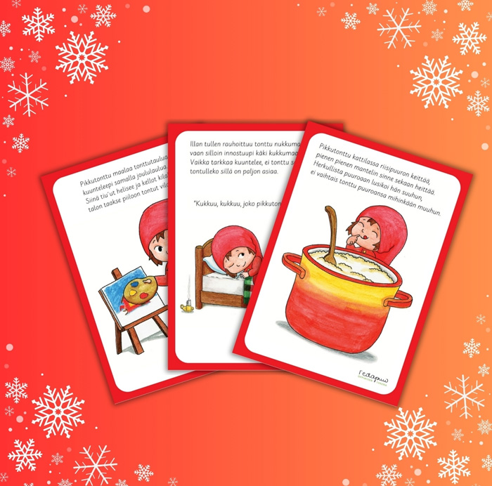 Pakkaus sisältää 24 leikkisää lorua ja ihanaa kuvaa pikkutontun puuhista. Kauniit kuvat ja riimimittaiset lorut ovat täynnä iloista joulun tunnelmaa! Ottakaa yhdessä lasten kanssa selvää, mitä ihania puuhia se pikkutonttu tekeekään. Valloittava pikkutonttu sulattaa varmasti jokaisen sydämet!