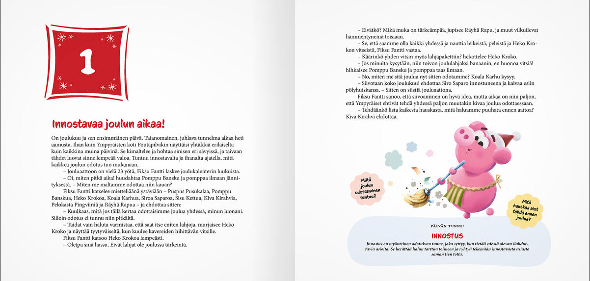 Ympyräiset ja joulun taikapiiri sisältää joulukalenterimaisesti luettavien lyhyiden satujen lisäksi tunnetaitoihin liittyviä tehtäviä ja keskustelunaiheita.