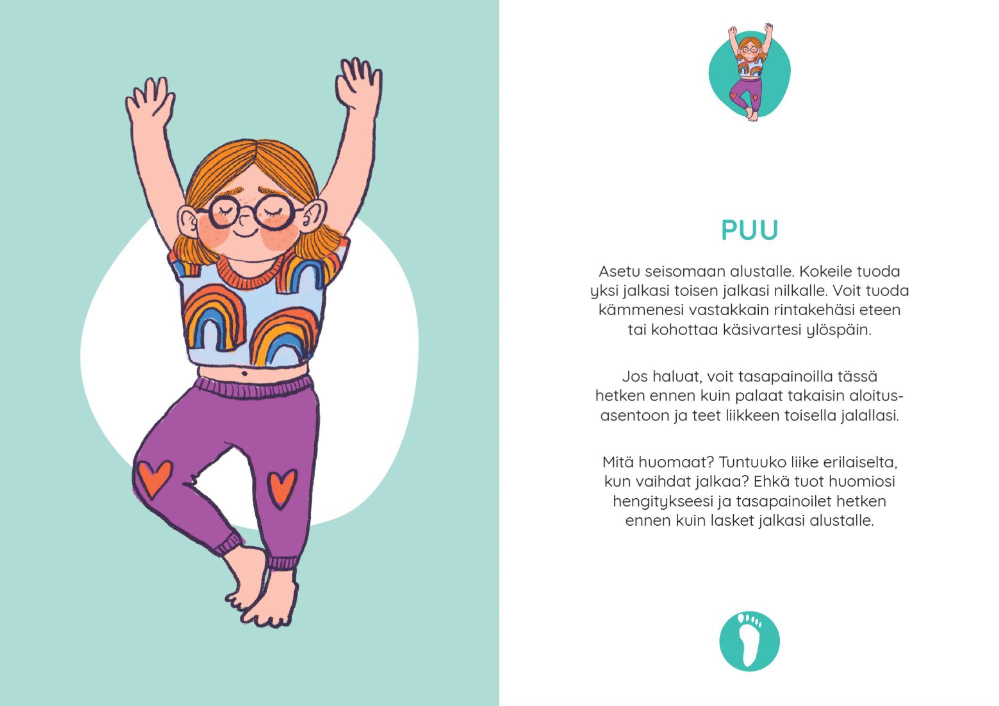Korttien avulla voit tukea lasten ja nuorten kykyä rauhoittua, keskittyä ja palautua sekä vahvistaa tunnetaitoja, kehotietoisuutta ja suoritusvapaan liikkumisen iloa.