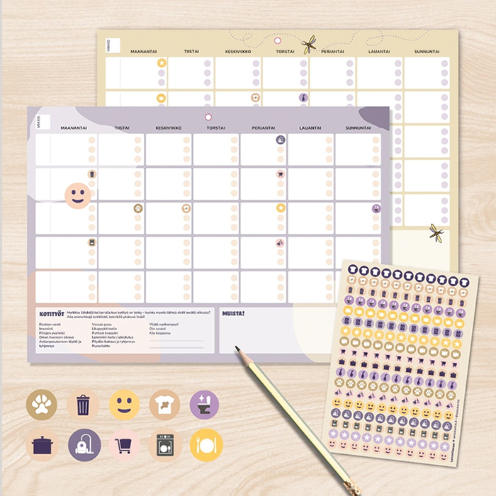 Nyt mukana myös kotityötarrat, jolloin voit kunkin päivän ja henkilön kohdalle merkitä joko tarralla tai rastilla suoritetut kotityöt.