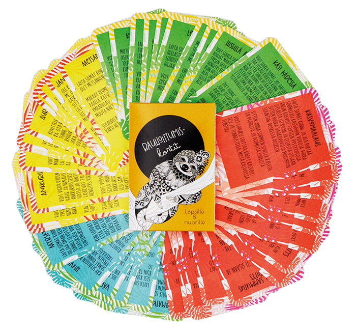 Korttien käyttö on helppoa: Sekoita korttipakka, nosta satunnaisesti yksi kortti ja tee harjoitus. Voit myös jaotella kortit värien mukaan — mitä kulloinkin kaipaat: