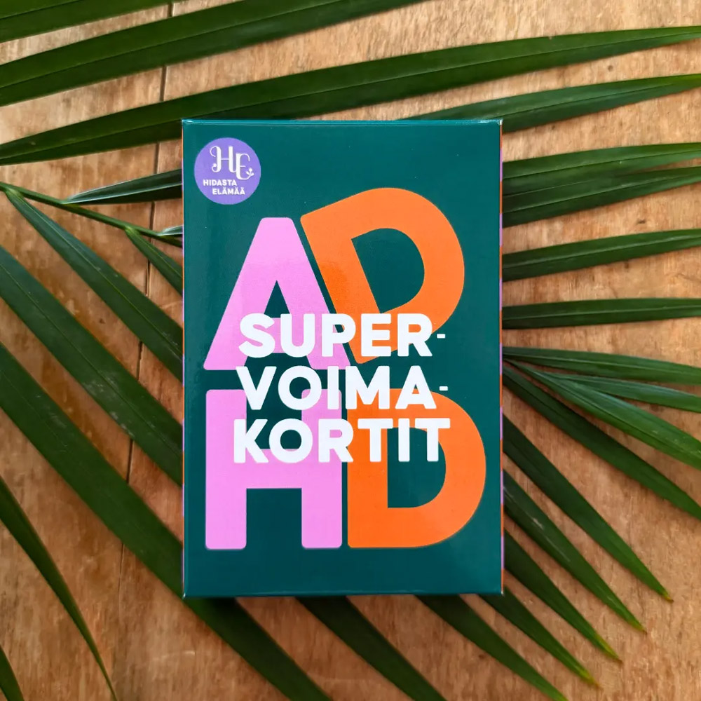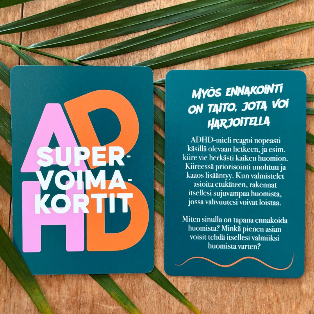 ADHD-supervoimakortit painottavat ADHD-aivojen vahvuuksia. ADHD-piirteisiin nimittäin liittyy mm. luovia sivupolkuja, erilaisuutta, spontaaniutta, rohkeutta, sosiaalista energiaa, kykyä innostua syvästi ja halua auttaa muita. Kortit kutsuvat tunnistamaan omia vahvuuksia, nimeämään niitä ja ottamaan niitä tietoisesti käyttöön arjessa.