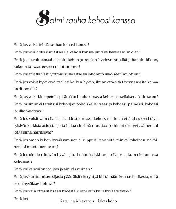 Tiedän, etten ole aina kohdellut sinua hyvin. Toisinaan olen yrittänyt, joskus myös onnistunut, mutta useimmiten vain ollut ilkeä ja vältellyt edes katsomasta sinua. Olen ajatellut, ettet ole kaunis — etten minä ole kaunis. Olen verrannut sinua toisennäköisiin, -kokoisiin ja -muotoisiin vartaloihin. Miettinyt, ettet riitä tuollaisena, ja kritisoinut jokaista kohtaa sinussa.