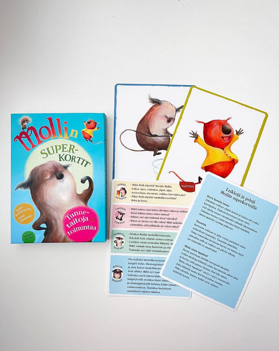 Valloittavat superkortit pohjautuvat rakastettuihin Molli-kirjoihin. Korteissa on useampi harjoitus, joista voi valita lapsen tai ryhmän tarpeisiin sopivat. Ihanat kuvat houkuttelevat pelaamaan, leikkimään ja tunnistamaan tunteita.