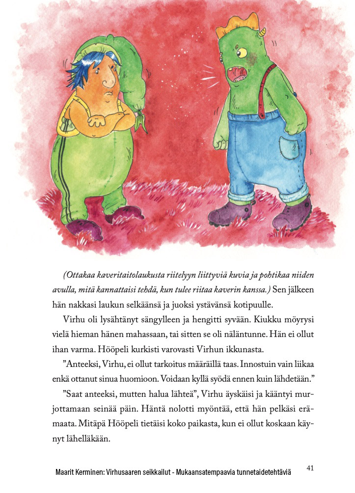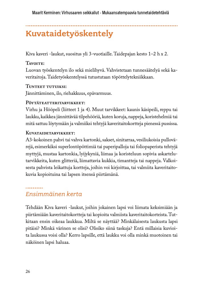 Virhusaaren seikkailut — Mukaansatempaavia tunnetaidetehtäviä on varhaiskasvatuksen sekä esiopetuksen opettajille suunniteltu tehtäväkirja, jossa tunne- ja ihmissuhdetaitoja harjoitellaan monipuolisten taideharjoitusten kautta. Tehtäviä tukevat upeasti kuvitetut sadut, jotka osallistavat oppilaita. Sadut luovat maailman, jossa on turvallista opetella ja tutustua kaikkiin arjessa koettuihin tunteisiin.