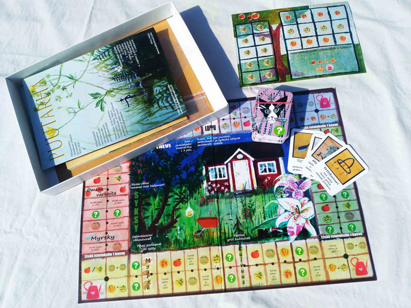 Pelipaketti sisältää: Pelilaudan, puutarhapihat 4 kpl, pisteytyslaatta, 86 tapahtumakorttia, 10 työkalukorttia, 125 pelikiekkoa, 8 pelinappulaa, nopan ja sääntövihkon.