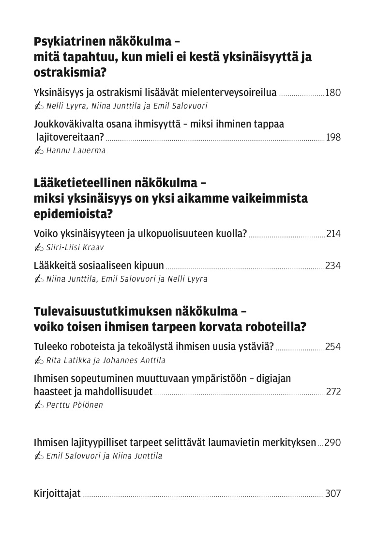 Ulkopuolisuus satuttaa, sairastuttaa ja saa taistelemaan toisia ihmisiä vastaan. Miksi ihminen voi huonosti ilman laumaa? Miksi ihminen tarvitsee toisia ihmisiä elääkseen hyvää ja merkityksellistä elämää?