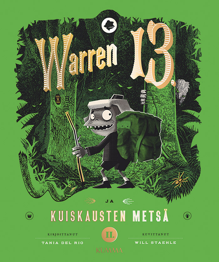 Warren 13. ja kuiskausten metsä on toinen osa upeasti kuvitettua ja kerrottua Warren 13. -sarjaa. Kirjan pääväri on vaihtunut punaisesta ilki-ihanaan myrkynvihreään, joka korostaa Warrenin tarinan aavemaista, viktoriaanista tunnelmaa.