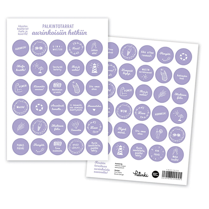 Pakkaus sisältää 2 erilaista A5 kokoista tarra-arkkia, joissa on hauskoja tekstejä ja kuvia. Yhden tarran halkaisija 24 mm. Tarrat sopivat esimerkiksi bujoiluun.Design: Viivi Lehto.