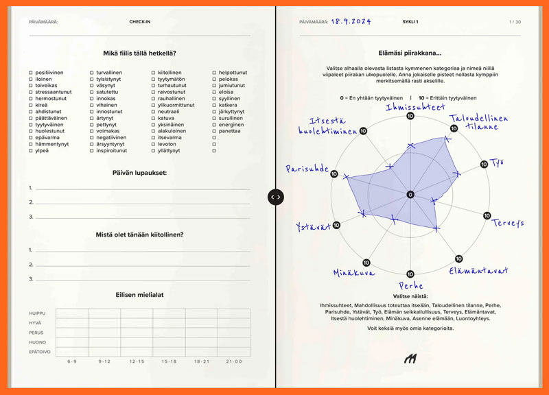 Kolmen kuukauden matka sisältää päivittäisen CHECK-IN-osion ja 30 ohjattua harjoitusta, joiden avulla opit ymmärtämään itseäsi paremmin ja tuot selkeyttä ajatuksiisi.