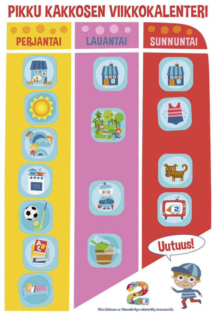 Lasten oma viikkokalenteri uudelleen kiinnittyvillä kuvakkeilla.
