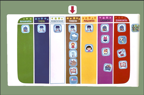 Viikkokalenterin avulla lapsi voi aktiivisesti osallistua päivä- ja viikko-ohjelman suunnitteluun. Kuvien tuella voi puhua tulevista tapahtumista ja harjoitella ajan hahmottamista sekä viikonpäiviä. Vaihdettavilla kuvakkeilla voi merkitä lapsen päivän askareet helposti näkyville.