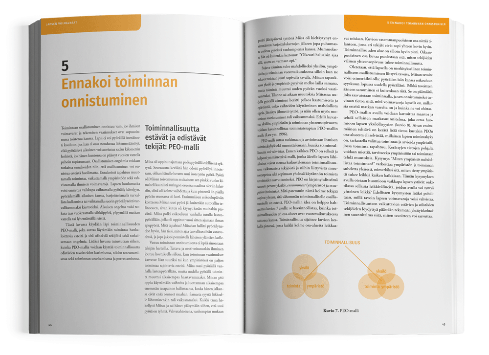 Osallistumisen ongelmia voidaan ratkaista ennakoiden niin, että osallistuminen voi onnistua esteistä huolimatta. Ennakointi tapahtuu muuttamalla toimintaa, vaikuttamalla ympäristöön sekä vahvistamalla ihmisen voimavaroja. Lapsen koulumatka voisi onnistua vaikkapa vaihtamalla pyöräily kävelyyn, pyöräilemällä aikuisen kanssa, harjoittelemalla turvallista kulkemista tai vaihtamalla suorin pyöräilyreitti turvallisemmaksi kiertotieksi. Aikuisen ongelma voisi rat- keta taas vuokraamalla sähköpyörä, yöpymällä matkan varrella tai lyhentämällä reittiä.