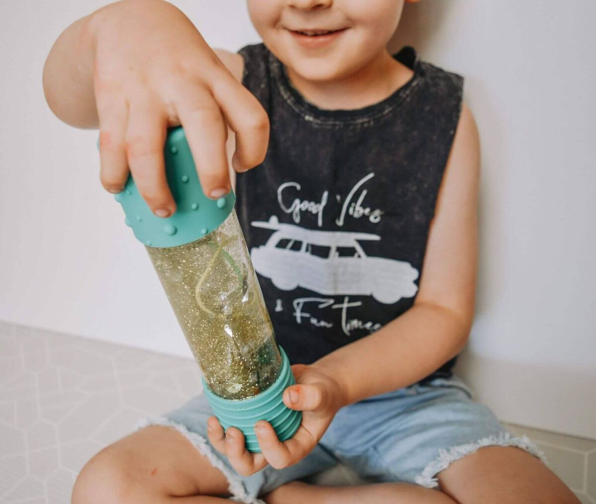 Rauhoittumispullon parissa voi pitää hauskaa, rentoutua ja oppia käsittelemään tunteita. Katso kuinka erilaiset kimalteet ja koristeet leijailevat pullossa. Kun keskityt purkissa hitaasti liikkuviin koristehileisiin, rauhattomuus ja levottomuus helpottavat. Pullon molemmissa päissä on silikoniset hatut, joiden erilaiset kosketuspinnat stimuloivat tuntoaistia. Kaunista ja mukavan tuntuista pulloa on kiva käsitellä ja sen pariin on helppo pysähtyä.