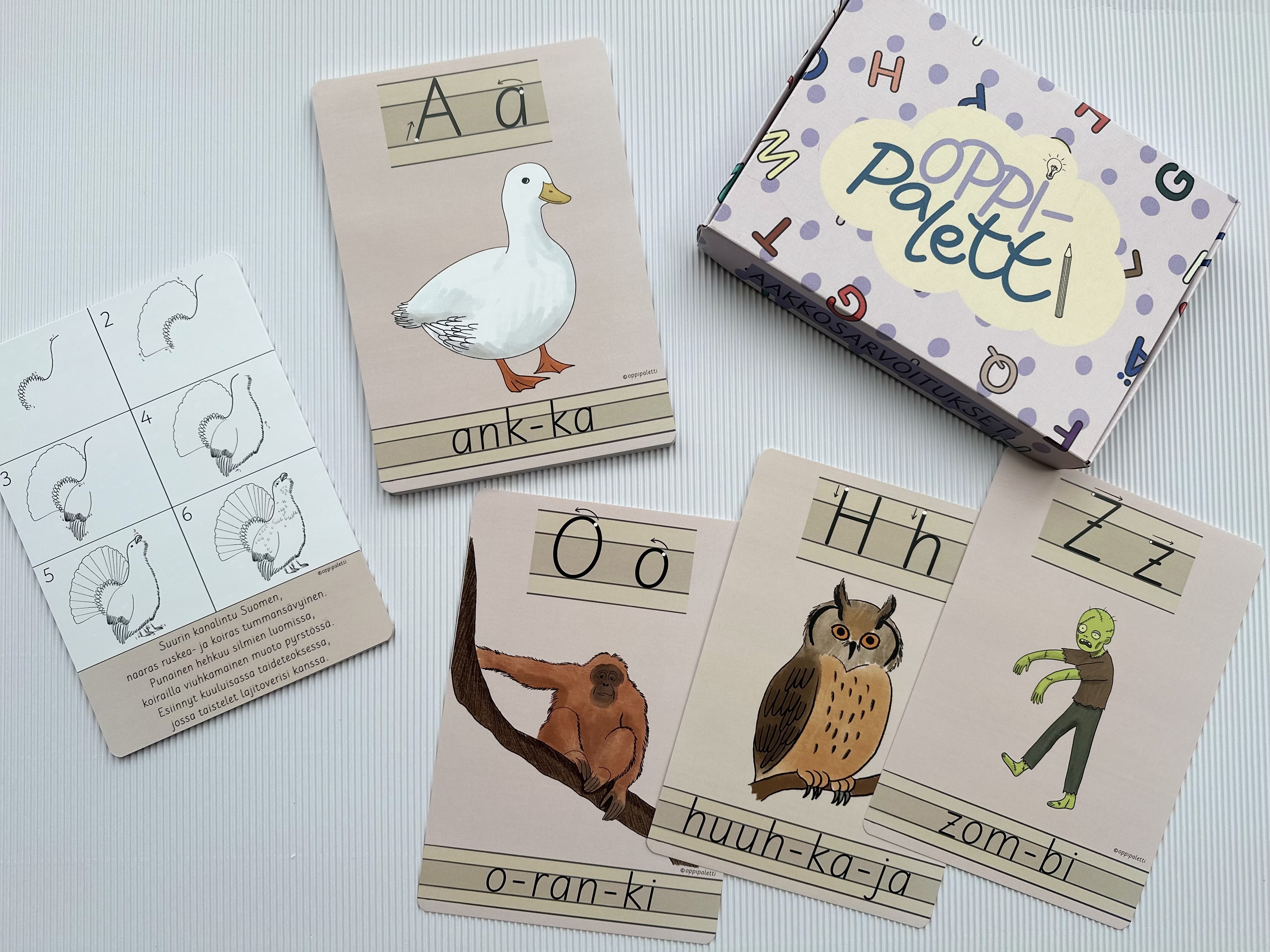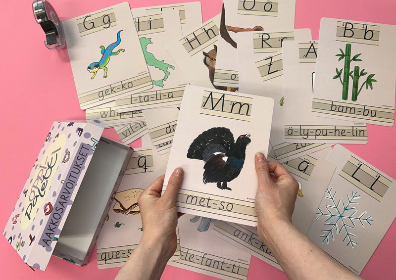 Korttien arvoitukselliset piirrokset ja lorut houkuttelevat oppilaat mukaan osallistumaan opittavan kirjaimen selvittämiseen.