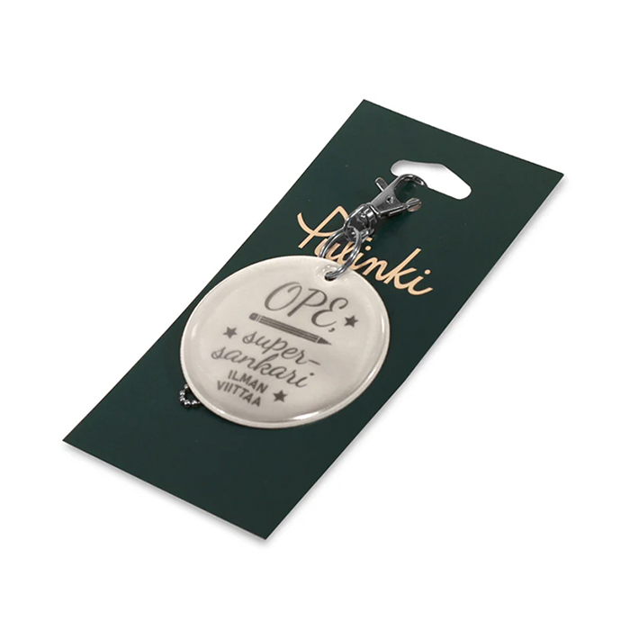 Suomalainen design heijastin!Heijastimessa teksti: "Ope, supersankari ilman viittaa." Sisältää papukaijalukon ja palloketjun.Koko: 7,5 x 11 cm. Palloketju: 7 cm. Design: Putinki Design. Valmistettu Suomessa.
