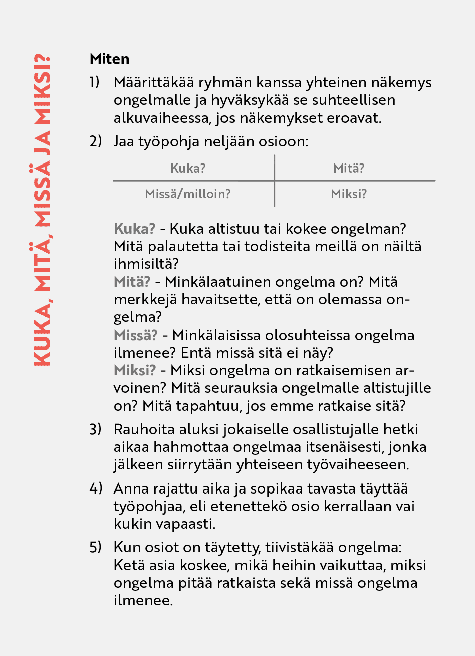 Voit rakentaa pakan menetelmien avulla ideointityöpajoja, kehityspalavereita ja ongelmanratkaisun tuumaustalkoita sekä tiimillesi yhteisesti pähkäiltäväksi että itsenäiseen työskentelyysi.