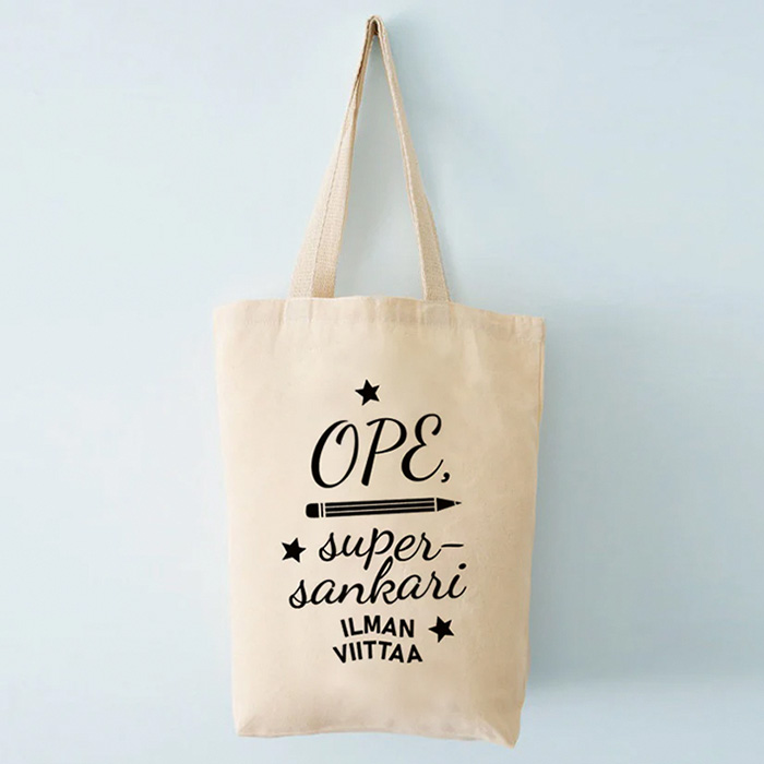 Täydellinen lahja opettajalle tai vaikkapa itsellesi!Luomupuuvillainen, reilun kaupan laadukas kangaskassi.Painettu teksti "Ope, supersankari ilman viittaa". Koko 36 x 40 cm + pohja 10 cm, 60 cm hihnat.