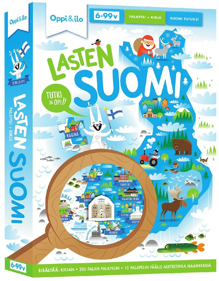 Pakkaus sisältää 200 palan palapelin, 10 palapelin päälle pystyyn aseteltavaa nähtävyyspalaa ja 18 sivuisen Suomi-aiheisen tietokirjan.