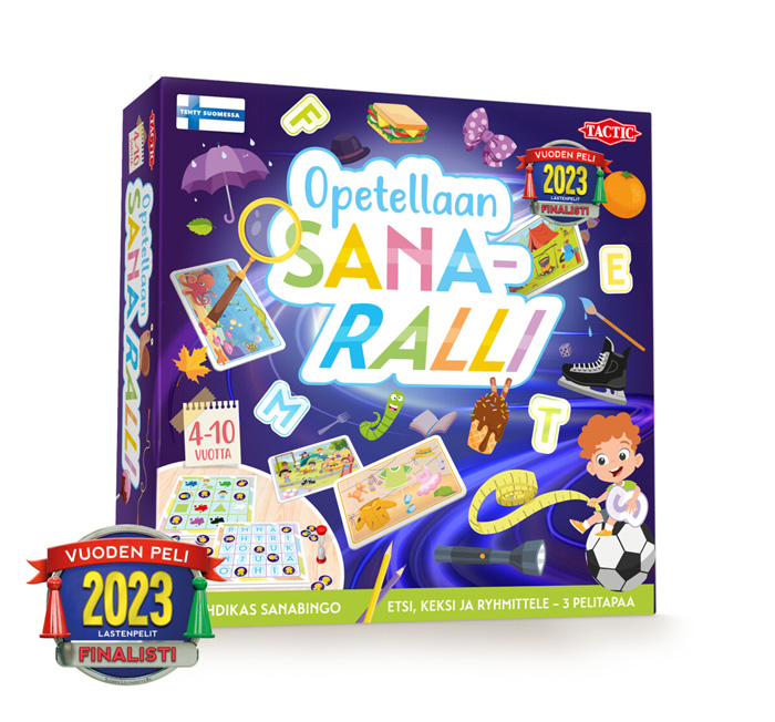 Tutkikaa kuvia ja etsikää kilpaa eri alkukirjaimilla alkavia sanoja. Jokaisesta sanasta saat pelimerkin bingolaudallesi. Ensimmäinen viiden rivi voittaa! Pelissä on kaksi tasoa — nuorimmat pelaavat kuvalaudoilla. Tukee lukemaan oppimista. Erikoiskortit tuovat peliin jännitystä! Mukana hauska luokittelupeli, joka kehittää sanavarastoa ja ajattelutaitoja.