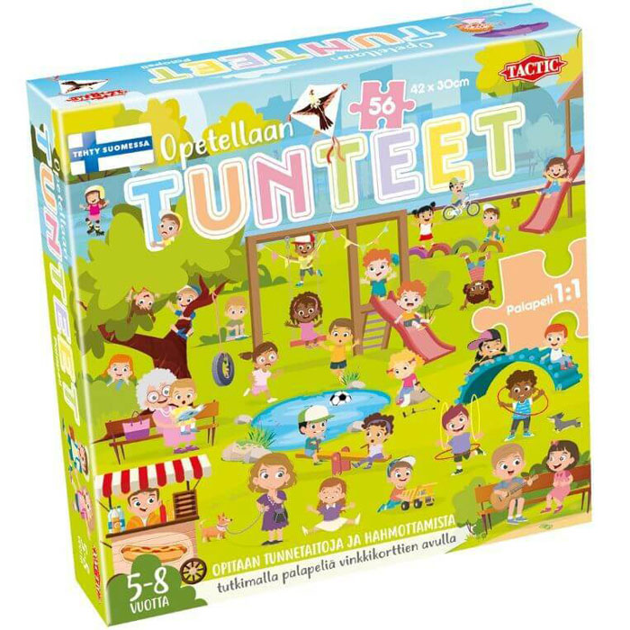 Tämä 56 palan palapeli tarjoaa aikuiselle ja lapselle mahdollisuuden tutkia erilaisia tunteita yhdessä. Vähitellen lapsi voi oppia ymmärtämään omia tunteitaan ja löytää sanat, joilla niistä voi puhua.