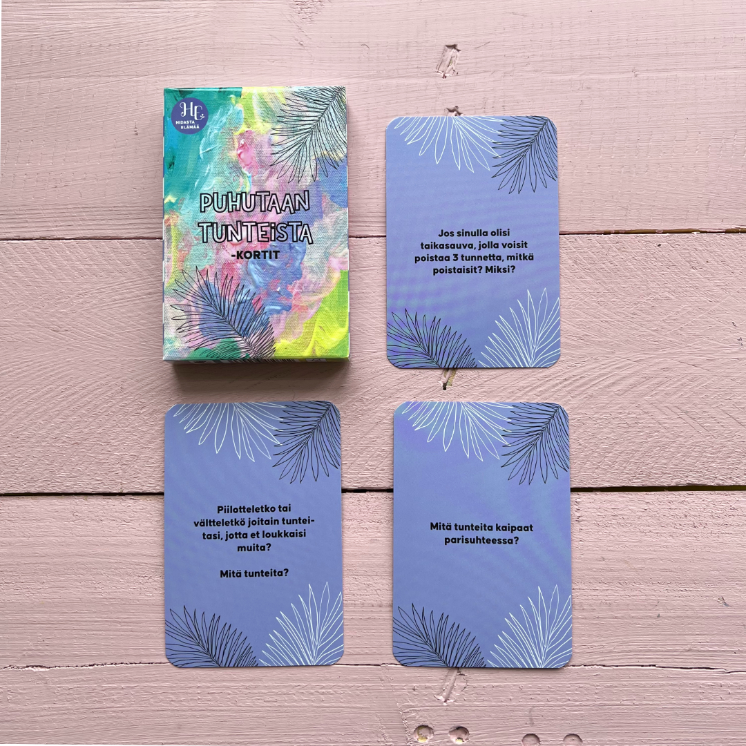 Pakka sisältää 42 kysymyskorttia, jotka herättävät pohtimaan omaa tunne-elämää aina lapsuudesta nykyisyyteen.