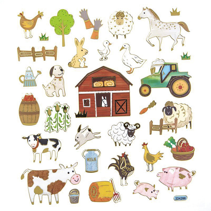 A5-tarra-arkki, jossa maatila-aihe. Tarrat kiiltävät kauniisti, niissä on myös UV-lakkapinnoite. 32 tarraa arkilla.