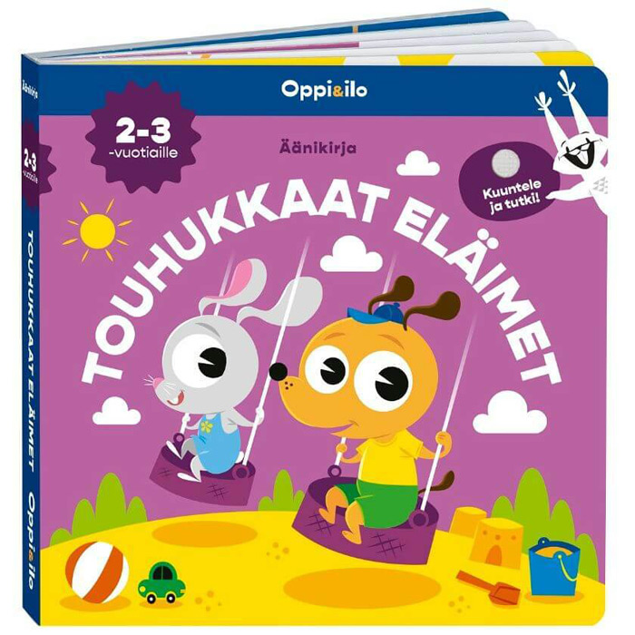 Suomenkielinen äänikirja Oppi&ilo Touhukkaat eläimet on ihastuttava, interaktiivinen äänikirja pienille lapsille. Minkä värisellä pallolla pupu leikkii? Minkä muotoisia keksejä kissa leipoo? Lapsi kuulee tehtävän painamalla nappia ja voi tehtävän ratkaistuaan kuunnella oikean vastauksen toista nappia painamalla. Tämä uudentyyppinen lastenkirja viihdyttää lasta takuuvarmasti kerta toisensa jälkeen. Kirjan parissa lapsi voi oppia muotoja, värejä ja lukumääriä sekä monia muita kiinnostavia asioita. Ihan itse! Lapselle lukeminen tukee lapsen puheen kehitystä ja yhteiset lukuhetket vahvistavat lapsen ja aikuisen välistä kiintymyssuhdetta.
